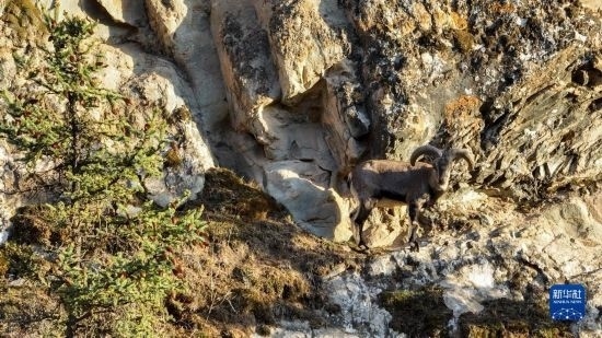 5月11日在內(nèi)蒙古賀蘭山國家級自然保護(hù)區(qū)拍攝的巖壁上的巖羊(無人機(jī)照片)。