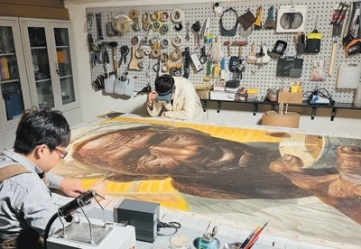 二〇二二年底,工作人員正在觀察油畫《父親》并準備進行修復(fù)。 寇旭乾攝