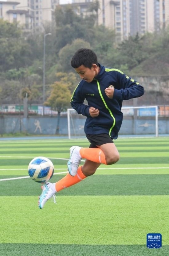 在瀘州天立春雨學(xué)校足球場(chǎng),來(lái)自涼山彝族自治州的楊坤在進(jìn)行訓(xùn)練(3月28日攝)。