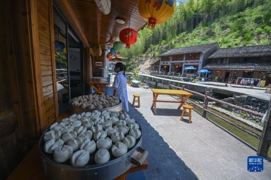 5月30日,布袋坑村的村民把剛蒸好的布袋山饅頭擺出來攤涼。