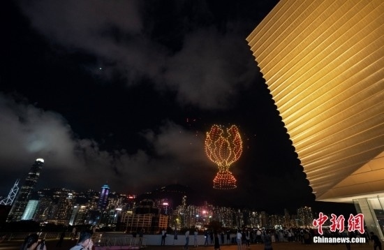 6月22日晚間,“紫荊花之夜”無(wú)人機(jī)燈光創(chuàng)意秀在香港故宮文化博物館畔的海面上空舉行,2000架無(wú)人機(jī)演繹多個(gè)與“端午節(jié)”相關(guān)的圖案,點(diǎn)亮香港夜空。圖為無(wú)人機(jī)組成紫荊花圖案。