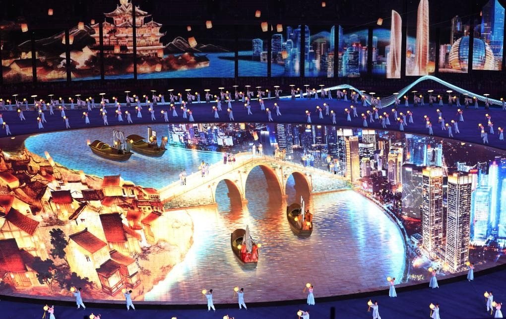 開幕式現(xiàn)場(chǎng)出現(xiàn)了杭州拱宸橋的形象。始建于1631年的拱宸橋,是京杭大運(yùn)河南端的標(biāo)志性建筑。2014年6月,中國大運(yùn)河成功申報(bào)世界文化遺產(chǎn),拱宸橋作為運(yùn)河水工建筑,成為一處遺產(chǎn)點(diǎn)。