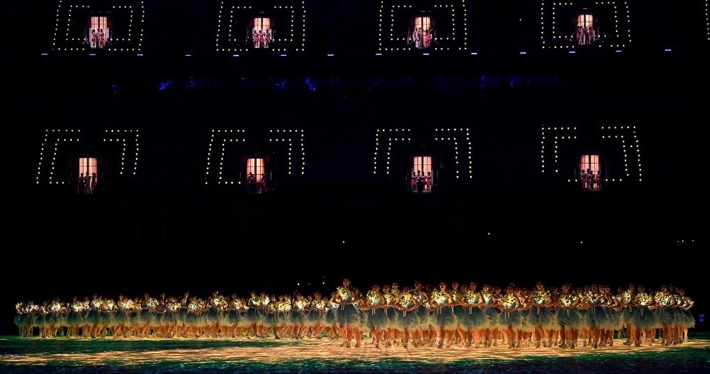 歌聲高潮處,觀眾席中近百扇“幸福之門”同時(shí)開啟。全場萬人合唱,現(xiàn)場每一名觀眾都成為開幕式“主角”,傳達(dá)“亞洲一家攜手同行”的美好愿望。