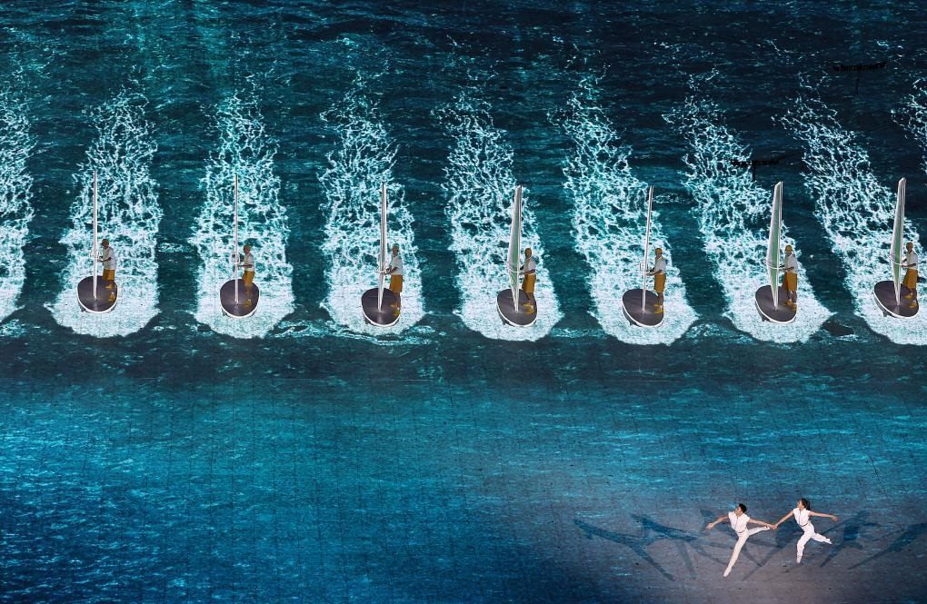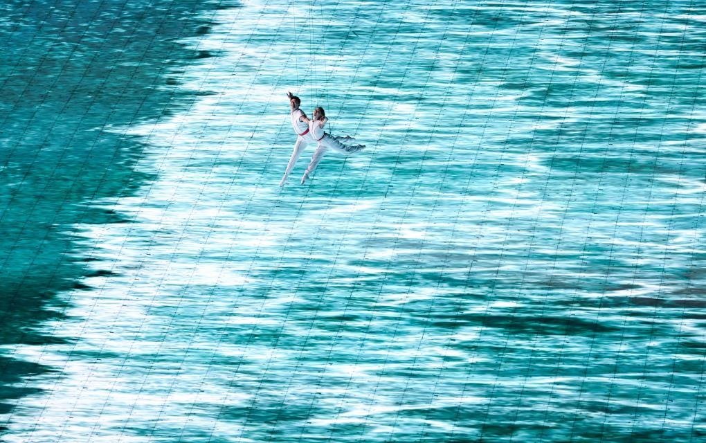 本屆亞運(yùn)會首次將3D雙威亞技術(shù)應(yīng)用于大型運(yùn)動場中。立體飛旋于空中的男女演員與潮共舞,吊著威亞的他們在空中完成了各種高難度動作,并與地屏中的浪潮實(shí)時(shí)互動,踏浪而行,成就了科技與藝術(shù)完美融合。