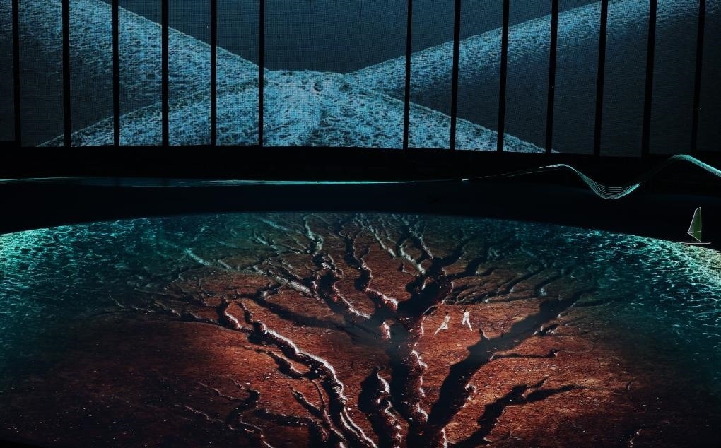 地屏上,交叉潮、一線潮、回頭潮、魚鱗潮等錢塘潮此起彼伏。這是寫實(shí)的潮,潮水的流動與翻涌都經(jīng)過精準(zhǔn)的“數(shù)字流體解算”技術(shù)計(jì)算,并進(jìn)行了超高比例的還原?!芭眱骸背酥鴽_浪板匯入潮中,與浪潮起伏相呼應(yīng)。