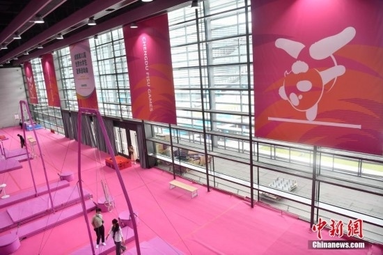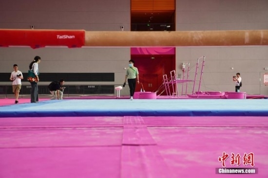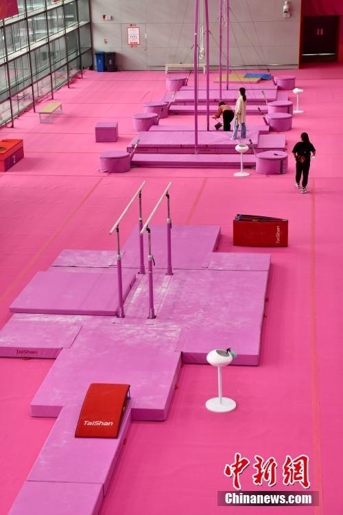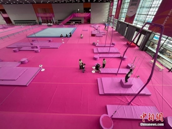 7月14日,成都東安湖體育公園內(nèi),成都大運會體操比賽訓(xùn)練場的粉色布置吸引媒體記者探訪。海綿墊、平衡木、吊環(huán)、鞍馬等設(shè)施均為粉色,充滿青春活力,令人倍感放松。目之所及,海綿墊、平衡木、吊環(huán)、鞍馬等設(shè)施均為粉色。