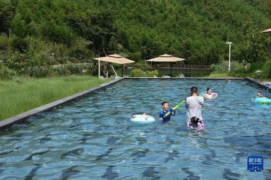 8月6日,小朋友在浙江省安吉縣山川鄉(xiāng)大里村一家民宿酒店的泳池戲水。