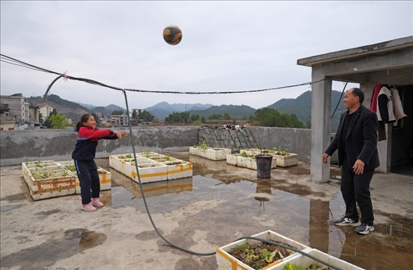 3月27日,李文文在屋頂露臺(tái)和父親玩投籃游戲。李文文是貴州臺(tái)江縣臺(tái)盤鄉(xiāng)中心小學(xué)的女籃隊(duì)長(zhǎng),以前他的父親在外地務(wù)工,如今火爆全網(wǎng)的“美麗鄉(xiāng)村”籃球聯(lián)賽給臺(tái)盤鄉(xiāng)帶來(lái)了人氣,父親在家門口就能找到工作。
