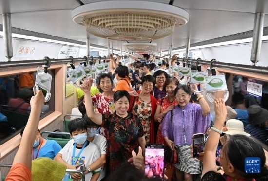 從8月8日起,北京地鐵一號線開行“時光列車”,6節(jié)車廂采用不同時代涂裝風(fēng)格。特別是綠色座椅、車廂頂部風(fēng)扇等元素,帶領(lǐng)乘客瞬間“穿越”,吸引人們紛紛打卡拍照?!皶r光列車”運(yùn)行時間是工作日14點(diǎn)至15點(diǎn),運(yùn)行區(qū)間是地鐵古城站至地鐵復(fù)興門站。