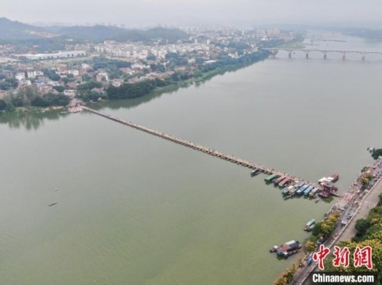 圖為10月2日,航拍橫臥于貢江之上的贛州東河浮橋。東河浮橋始建于南宋乾道年間,距今已有800多年歷史,該浮橋全長(zhǎng)約400米,連接贛州主城區(qū)和對(duì)岸的水東鎮(zhèn),方便著兩岸民眾的出行。劉力鑫 攝