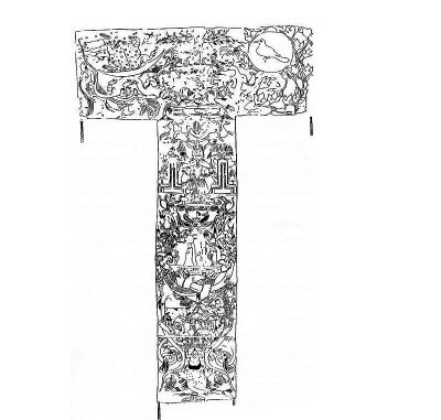 需要指出的是,這一進(jìn)程和墓主人辛追靈魂升仙的進(jìn)程是同步的。馬王堆漢墓T形帛畫的構(gòu)圖和漢代畫像石天界、人間、地下世界的三段模式非常近似,所以很多學(xué)者據(jù)此將T形帛畫也劃分為天界、人間、地下三部分。但這種看法我不贊成。我比較贊同T形帛畫的主題是引魂升天的主張。日本京都大學(xué)教授曾部川寬對(duì)漢代靈魂升仙的主題有非常深入的研究。1981年他出版的《向昆侖山升仙——古代中國(guó)人描繪的死后世界》(《崑崙山への昇仙——古代中國(guó)人が描いた死後の世界》)中,指出這幅非衣的主題就是升仙主題。整幅T形帛畫描述的是墓主人辛追升仙的進(jìn)程。從下到上,T形帛畫中央整個(gè)中軸貫穿著的是一個(gè)升騰的主題。陰陽(yáng)兩條龍自下而上在中央部分穿璧而過(guò),托舉起魂車。魂車上的核心人物通常認(rèn)為就是墓主人辛追。按照這一解釋,中間部分描繪的并不是我們生活的人間,而是從地下向天界升騰的墓主人辛追不斷升向仙界的魂魄。畫面上她的魂魄正被二龍牽引的魂車引向天門。從時(shí)間上說(shuō),辛追的魂魄將要進(jìn)入的,同樣是由死亡而再生的進(jìn)程。