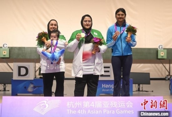 在SH1級女子10米氣手槍頒獎儀式中,伊朗選手薩雷赫抱著三個月大的兒子登上亞軍的領獎臺。與獎牌、花束一同呈上的,還有官方特意贈予小朋友的杭州第4屆亞殘運會吉祥物“飛飛”玩偶。