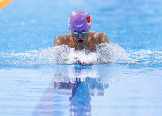 11月1日,南京市選手董志豪在比賽中,他獲得男子100米蛙泳公開組冠軍。當(dāng)日,第一屆全國學(xué)生(青年)運(yùn)動會游泳項目比賽在廣西南寧開賽。新華社記者 胡星宇 攝