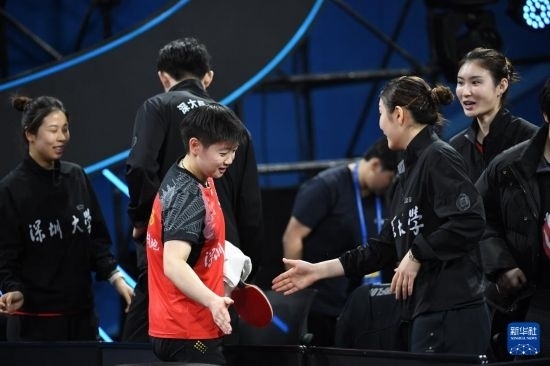 12月22日,深圳大學(xué)隊(duì)選手孫穎莎在女團(tuán)半決賽中。她以3比0戰(zhàn)勝華東理工大學(xué)隊(duì)選手王藝迪。最終深圳大學(xué)隊(duì)以總比分3比1戰(zhàn)勝華東理工大學(xué)隊(duì)。新華社記者 梁旭 攝