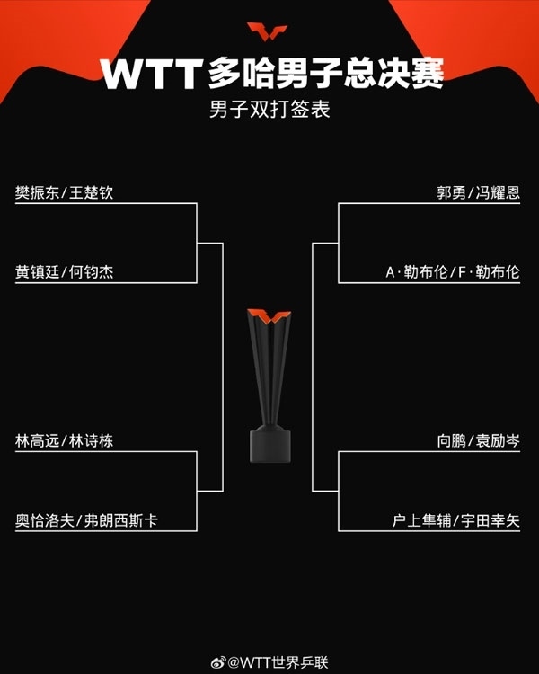 男雙選手分別是:樊振東/王楚欽、張禹珍/林仲勛、宇田幸矢/戶上隼輔、林高遠(yuǎn)/林詩棟、艾利克斯· 勒布倫/費(fèi)利克斯·勒布倫、帕特里克·弗朗西斯卡/迪米特里·奧恰洛夫、莊智淵/林昀儒、黃鎮(zhèn)廷/何鈞杰。