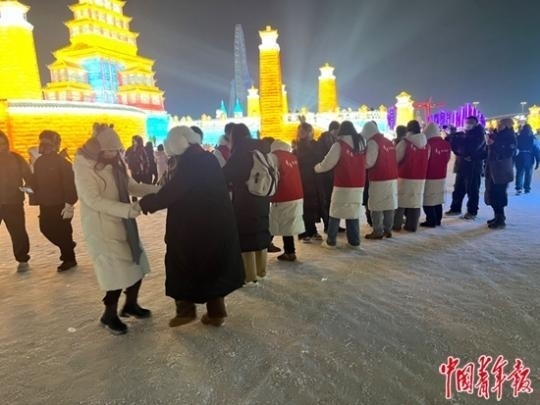 1月4日,哈爾濱冰雪大世界,大學生志愿者與游客一起跳兔子舞。中青報·中青網(wǎng)記者 金卓攝