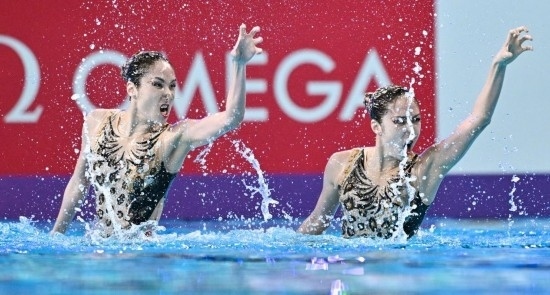 2月6日,中國隊教練張曉歡(左)、安娜在場邊觀賽。當日,2024年世界游泳錦標賽花樣游泳集體技術自選決賽在卡塔爾多哈舉行,中國隊獲得冠軍。新華社記者 夏一方 攝