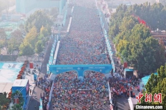 2023年10月15日,2023天津馬拉松鳴槍開跑,參加半馬的選手從起點(diǎn)出發(fā)。(無人機(jī)照片) 佟郁 攝