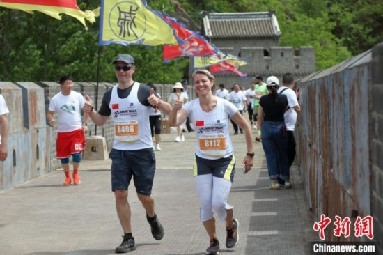 2023年5月21日,黃崖關(guān)長城國際馬拉松賽在天津市薊州區(qū)鳴槍開跑。圖為國外選手在比賽中穿越黃崖關(guān)長城。張彥 攝