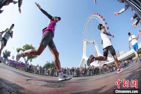 2023年10月,天津馬拉松時(shí)隔17年后重返市區(qū)進(jìn)行比賽,共吸引了29個(gè)國家和地區(qū)約9.5萬人參與報(bào)名。途經(jīng)7個(gè)行政區(qū)的線路串聯(lián)起天津五大道、民園廣場(chǎng)、世紀(jì)鐘、天津之眼等諸多天津城市地標(biāo)型建筑和知名景點(diǎn),“驚艷”著來自世界各地的參賽選手。