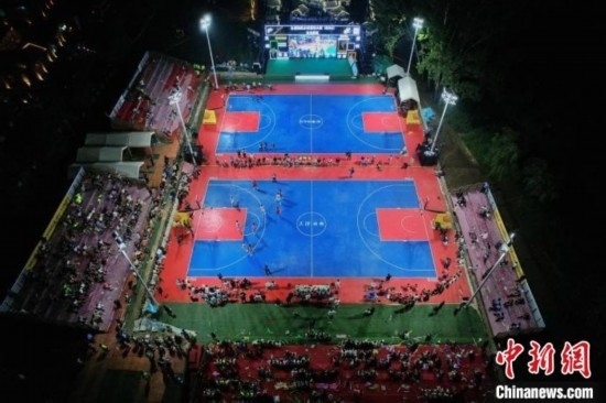 2023年8月2日晚,全國和美鄉(xiāng)村籃球大賽(村BA)東北賽區(qū)揭幕戰(zhàn)在天津市薊州區(qū)郭家溝村開賽。圖為比賽現(xiàn)場(chǎng)。佟郁 攝