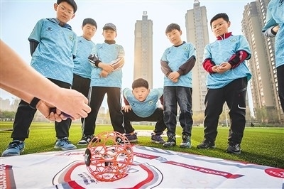 河北省唐山市豐南區(qū)胥各莊小學(xué)學(xué)生正在學(xué)習(xí)無(wú)人機(jī)足球操作要領(lǐng)。李福政攝(人民視覺(jué))