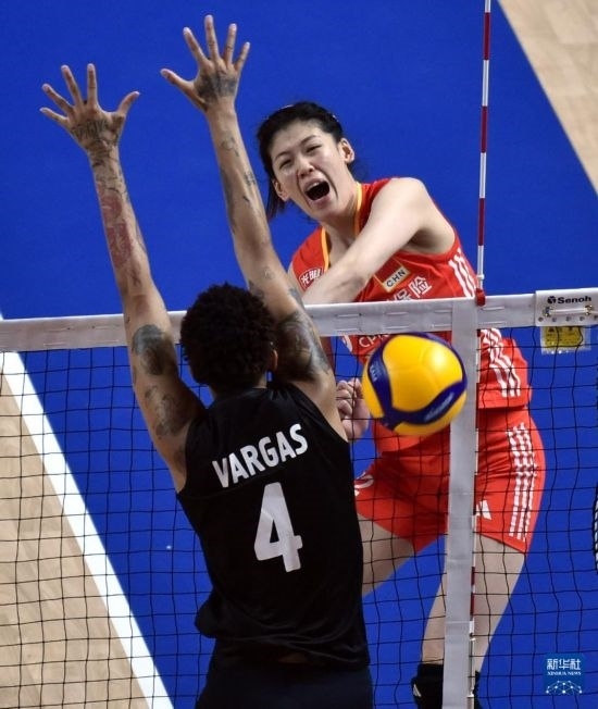 6月15日,中國(guó)隊(duì)球員王媛媛在比賽中扣球。新華社記者盧炳輝攝