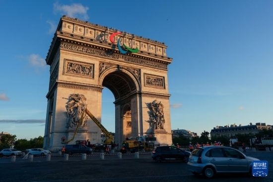 6月28日,施工人員在法國(guó)巴黎凱旋門懸掛殘奧會(huì)標(biāo)志。新華社記者 許暢 攝
