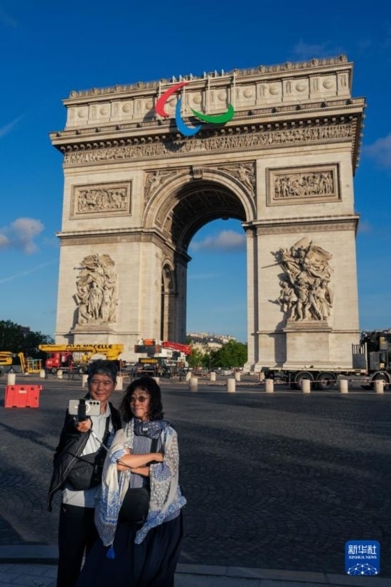 6月28日,游客在懸掛有殘奧會(huì)標(biāo)志的法國(guó)巴黎凱旋門附近拍照留念。新華社記者 許暢 攝