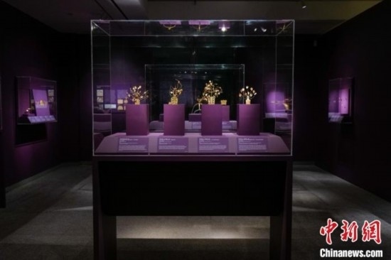 當(dāng)?shù)貢r(shí)間9月4日,百余件遼寧三燕文物亮相紐約華美協(xié)進(jìn)社中國美術(shù)館秋季特展《龍城之金:遼寧三燕文物選萃,337-436》。圖為展覽現(xiàn)場的金步搖。 中新社記者 王帆 攝