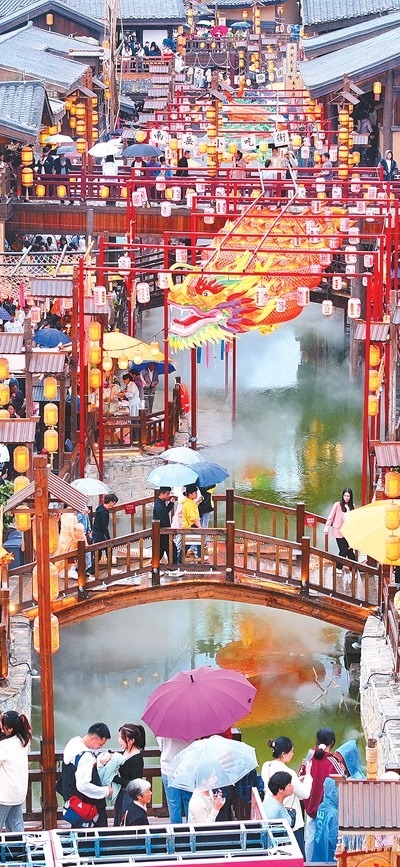 龍門浩老街上,幾名外地游客沿著青石臺階漫步至老街最高點(diǎn)——攬月臺,遠(yuǎn)眺渝中半島。這條位于重慶市南岸區(qū)南濱路中段的老街,面朝長江,背依南山,開埠文化、巴渝文化等文化底蘊(yùn)深厚。近年來,經(jīng)過保護(hù)與修繕,這里不僅恢復(fù)了歷史風(fēng)貌,還增添了現(xiàn)代時尚氣息。古色古香的街道兩旁,新潮的商鋪、餐館和咖啡館為市民游客休閑購物提供便利和全新體驗。“感受時光交錯的美妙”,成為這里的一大魅力。數(shù)據(jù)顯示,自發(fā)展全域旅游以來,龍門浩老街所在的龍門浩街道已接待游客近4000萬人次,實(shí)現(xiàn)旅游收入276.8億元,龍門浩老街還成功創(chuàng)建第二批國家級夜間文旅消費(fèi)聚集區(qū)。