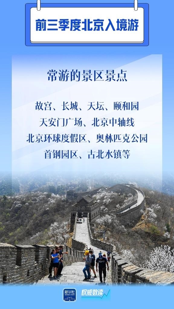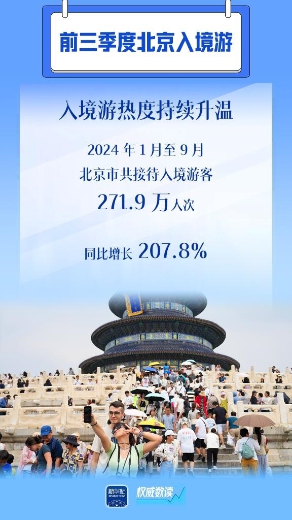 隨著中國免簽“朋友圈”持續(xù)擴(kuò)容、便利人員往來措施不斷優(yōu)化,北京入境游市場加快恢復(fù)。北京市文化和旅游局日前發(fā)布數(shù)據(jù)顯示,2024年1月至9月,北京共接待入境游客271.9萬人次,同比增長207.8%。從單月恢復(fù)情況看,5月以來市場恢復(fù)速度加快,9月為年初以來的峰值,入境游客達(dá)38.4萬人次,增長趨勢明顯,正逐步接近2019年同期水平。