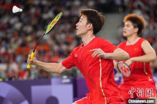 資料圖:當?shù)貢r間8月4日,在巴黎奧運會羽毛球男子雙打決賽中,中國組合梁偉鏗/王昶奪得銀牌。圖為梁偉鏗/王昶(前)在比賽中。 記者 趙文宇 攝