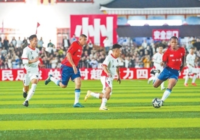 貴州“村超”一場中外友誼賽中,中國球員和巴西球員在比賽中拼搶。 周光勝攝(影像中國)