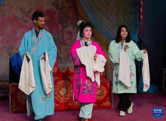 12月8日,游客在官渡古鎮(zhèn)“古渡梨園”體驗滇劇表演。