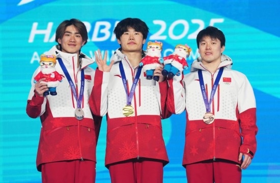 2月9日,楊龍嘯、李心鵬和齊廣璞(從左至右)在頒獎儀式上。新華社記者 王松 攝