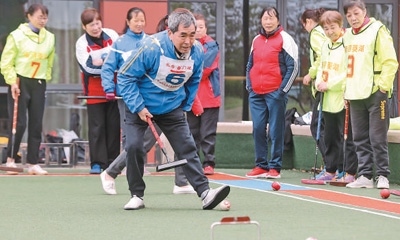 浙江省湖州市德清縣市民活動(dòng)中心,老年門球愛(ài)好者在揮桿競(jìng)技。