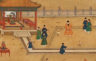 捶者,打也;丸者,球也。“不少學(xué)生剛接觸捶丸時(shí),說(shuō)它像現(xiàn)代的高爾夫。其實(shí),捶丸比高爾夫運(yùn)動(dòng)歷史更悠久?!逼巾斏綄W(xué)院陶瓷學(xué)院院長(zhǎng)梅國(guó)建介紹,捶丸源自唐代擊鞠(馬球)和步打球,傳至宋朝逐漸演變?yōu)橐来螕羟虻姆菍?duì)抗性比賽,名稱也變?yōu)榇吠?,現(xiàn)藏于故宮博物院的《明宣宗行樂(lè)圖》中就描繪了宮中捶丸的場(chǎng)景。