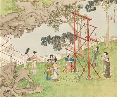 秋千,古稱“千秋”,可追溯至春秋時(shí)期,后改為“秋千”。據(jù)《荊楚歲時(shí)記》記載:“春時(shí)懸長(zhǎng)繩于高木,士女衣彩服坐于其上而推引之,名曰打秋千?!痹诠糯?,清明節(jié)更是有著秋千節(jié)的別稱,可見(jiàn)古人對(duì)春日蕩秋千的喜愛(ài)。
