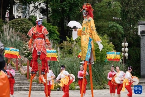 4月18日,演員在活動中展示踩高蹺。
