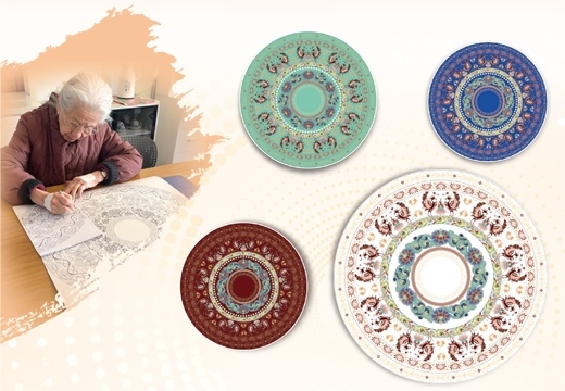 這個展項由94歲的著名工藝美術(shù)家常沙娜領(lǐng)銜創(chuàng)作,影像由中影(北京)電影制片廠有限公司制作。影像以4幅敦煌紋樣圖開篇?!耙还仓谱髁她堷P兩個版本,每一版都包含石青、石綠、紅、白4個顏色。敦煌寶相花、蓮花、龍鳳等元素均取自我臨摹的敦煌紋樣,都是象征吉祥、繁榮的紋樣?!背I衬冉榻B,“鳳鳥取自五代428窟,寓意吉祥的祝愿;牡丹纏枝紋,代表繁榮、吉祥之意;石榴卷草紋,傳達(dá)了吉祥和豐富美好的寓意;雙龍吐珠紋樣也寓意吉祥喜慶;龍鳳紋樣圖案組合成和諧的圓盤,有龍鳳呈祥之意?!?/p>