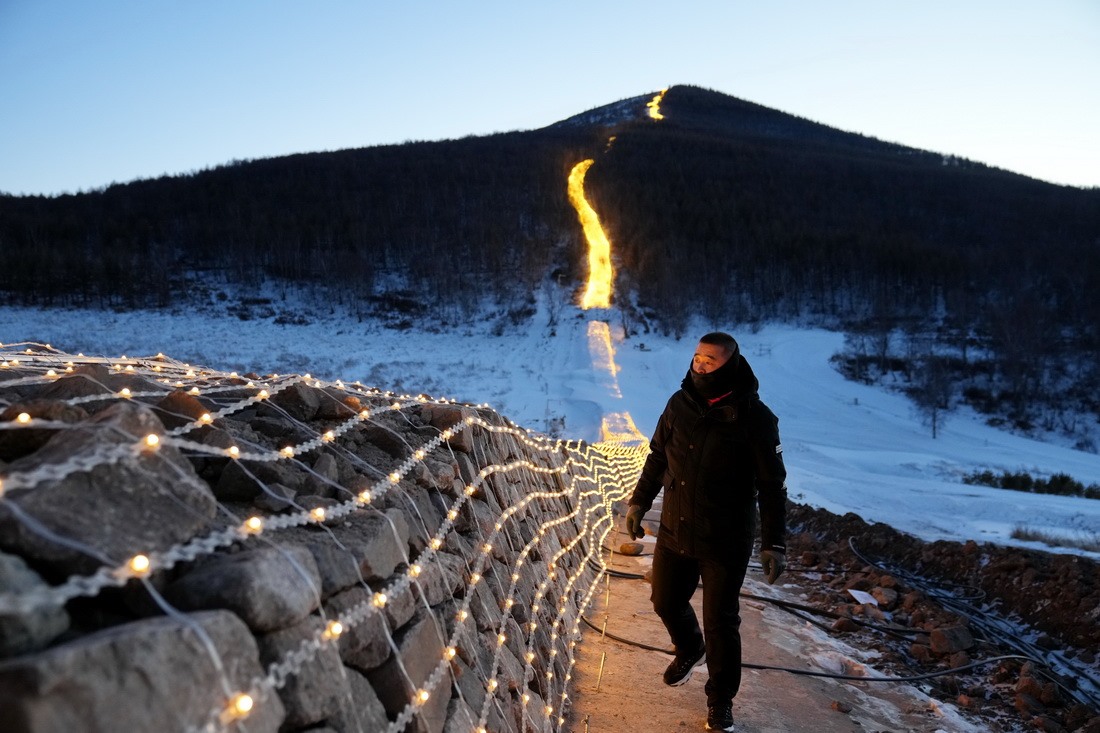 12月30日,工作人員在崇禮長(zhǎng)城景觀展示亮化工程現(xiàn)場(chǎng)巡查。新華社記者 牟宇 攝