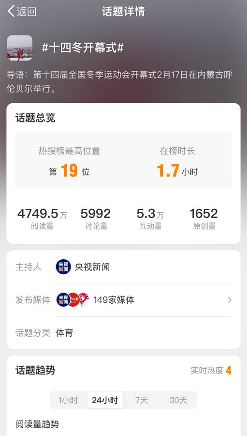 國(guó)內(nèi)多家主流媒體對(duì)開幕式進(jìn)行報(bào)道,話題#十四冬開幕式# #十四冬點(diǎn)火超燃瞬間#等話題登上微博熱搜榜,閱讀量近8000萬。