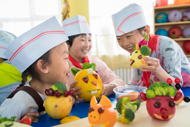 呼和浩特市五塔寺東街小學(xué)的學(xué)生在制作“果蔬笑臉”。