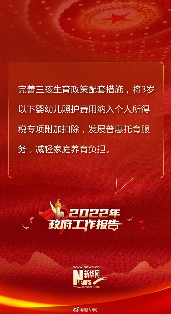 加強(qiáng)社會(huì)保障和服務(wù)。穩(wěn)步實(shí)施企業(yè)職工基本養(yǎng)老保險(xiǎn)全國(guó)統(tǒng)籌,適當(dāng)提高退休人員基本養(yǎng)老金和城鄉(xiāng)居民基礎(chǔ)養(yǎng)老金標(biāo)準(zhǔn),確保按時(shí)足額發(fā)放。繼續(xù)規(guī)范發(fā)展第三支柱養(yǎng)老保險(xiǎn)。加快推進(jìn)工傷和失業(yè)保險(xiǎn)省級(jí)統(tǒng)籌。做好軍人軍屬、退役軍人和其他優(yōu)撫對(duì)象優(yōu)待撫恤工作。積極應(yīng)對(duì)人口老齡化,優(yōu)化城鄉(xiāng)養(yǎng)老服務(wù)供給,支持社會(huì)力量提供日間照料、助餐助潔、康復(fù)護(hù)理等服務(wù),鼓勵(lì)發(fā)展農(nóng)村互助式養(yǎng)老服務(wù),推動(dòng)老齡事業(yè)和產(chǎn)業(yè)高質(zhì)量發(fā)展。完善三孩生育政策配套措施,將3歲以下嬰幼兒照護(hù)費(fèi)用納入個(gè)人所得稅專(zhuān)項(xiàng)附加扣除,發(fā)展普惠托育服務(wù),減輕家庭養(yǎng)育負(fù)擔(dān)。強(qiáng)化未成年人保護(hù)。提升殘疾預(yù)防和康復(fù)服務(wù)水平。加強(qiáng)民生兜底保障和遇困群眾救助,努力做到應(yīng)保盡保、應(yīng)助盡助。