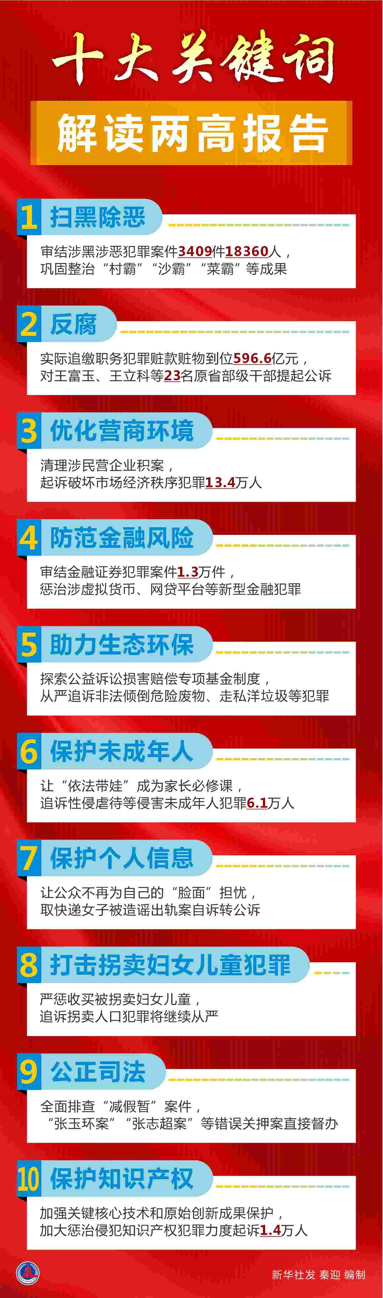兩高報告凸顯依法治國的決心與力度。點(diǎn)名秦光榮、王富玉、王立科等落馬腐敗分子,提及陶革涉黑案、張玉環(huán)案、取快遞女子被造謠出軌案等引發(fā)社會關(guān)注的案件。常態(tài)化掃黑除惡、高壓反腐、打擊拐賣婦女兒童犯罪、保護(hù)公民個人信息等法治重點(diǎn),與群眾關(guān)切高度契合。