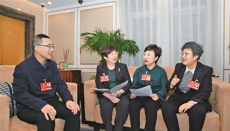 3月4日,住內(nèi)蒙古全國(guó)政協(xié)委員納日碧力戈、鄂曉梅、凌云、杜明燕(從左到右)在駐地?zé)嶙h全國(guó)政協(xié)常委會(huì)工作報(bào)告。記者 王鵬 攝