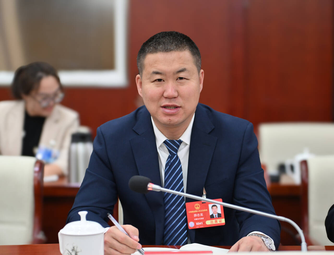 3月9日,全國人大代表奇飛云(右)在審議“兩高”工作報告時建議,加強對環(huán)境資源專業(yè)審判人才的培養(yǎng)力度。草原云記者 于濤 攝