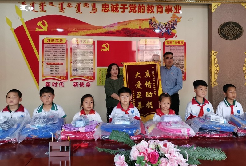 活動(dòng)當(dāng)天,人們來到阿拉善左旗蒙古族實(shí)驗(yàn)小學(xué),為烏日力格等10位貧困蒙古族學(xué)生送去學(xué)生用品及衣物,雙方支部還為學(xué)校捐贈(zèng)無限極植雅洗手液兩箱。