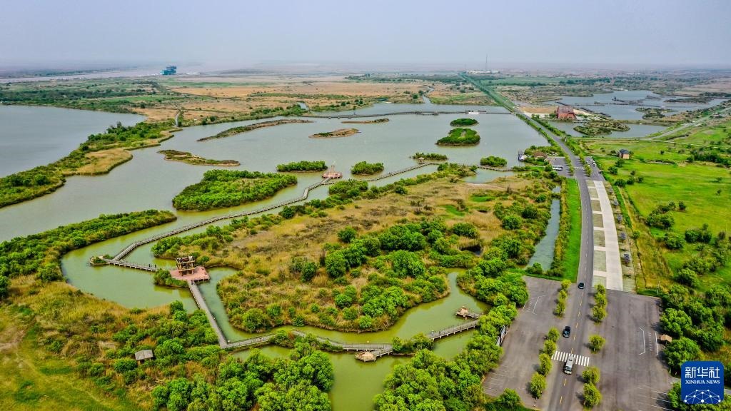 夏日的東營(yíng)市黃河入??跐竦?,綠草連天、百鳥(niǎo)翔集。